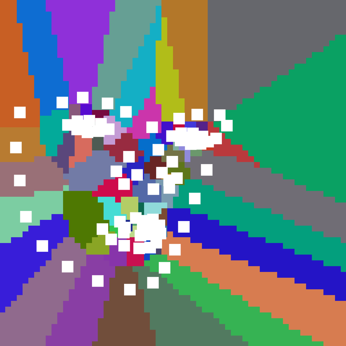 This is an experimental camera. It captures users face with an array of points, then creates randomly colored Voronoi patterns.